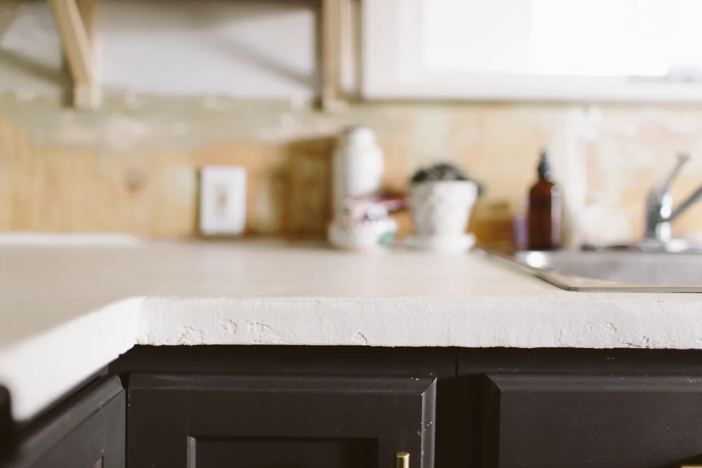 A black concrete countertop holds up to daily wear on the prep area.